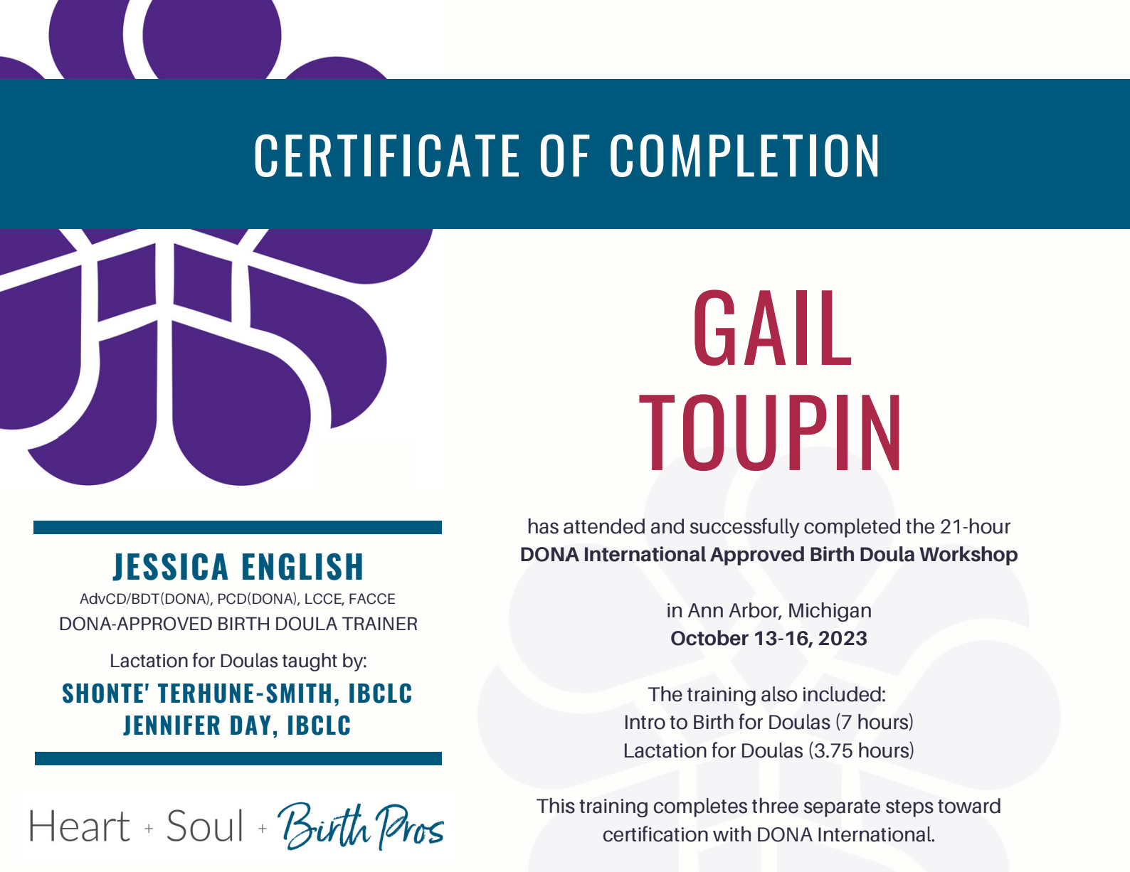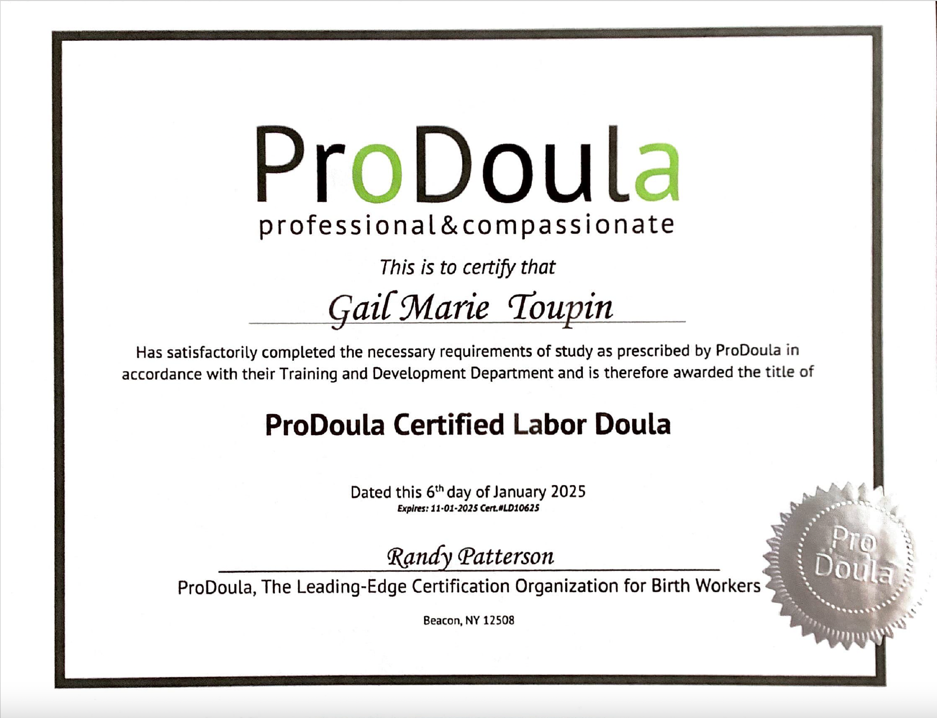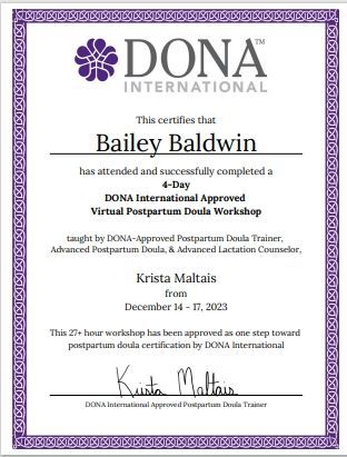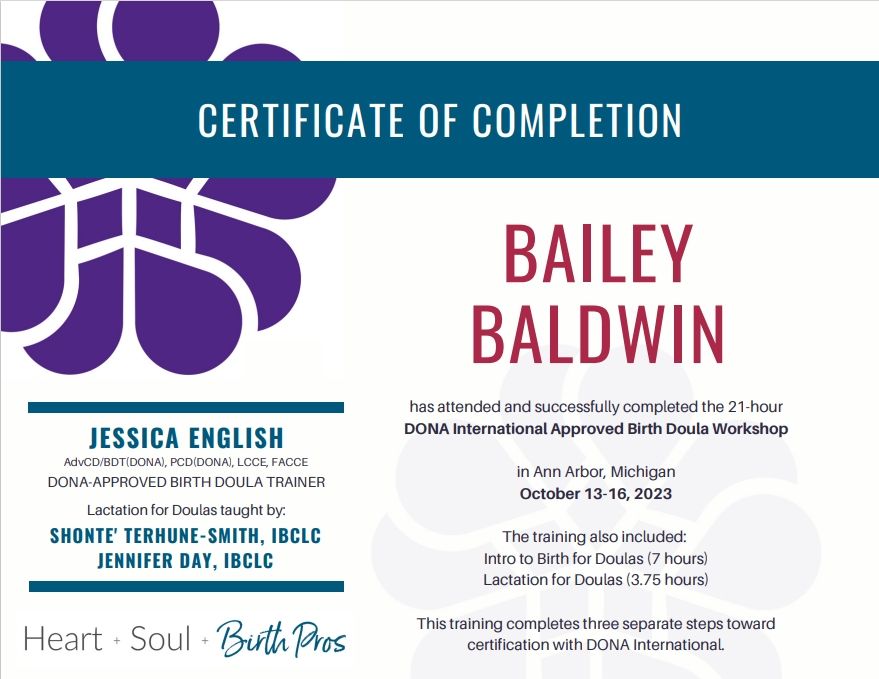 I am a certified Labor Doula and Postpartum Doula through ProDoula. I am also a certified health coach through the Institute for Integrative Nutrition.